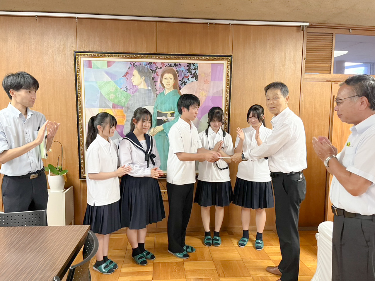 今回の東海大会出場を受けて同窓会では2025年9月18日(木)に校長室で部員代表に部活動奨励金を授与させて頂きました。石川会長からの「ご苦労様でした、頑張りましたね」と労いのお声がけに対し、部員たちからは「お世話になった先輩方でも成しえなかった東海大会出場は嬉しい」「指導して下さった先輩、先生方に感謝」「自分のパートはしっかり練習したのでみんなに迷惑かけなくてよかった」「この経験を下級生たちにも味わってほしい」「下級生たちの力になれるよう、一緒に頑張る」などの声が寄せられました。